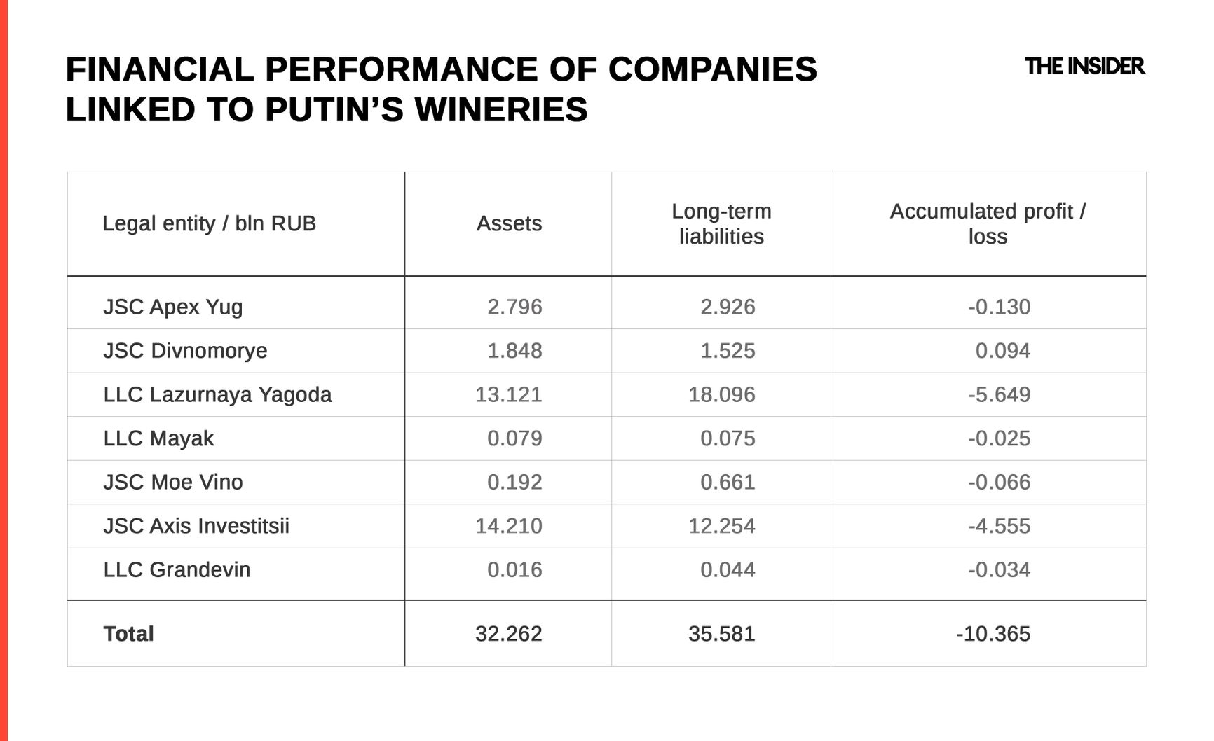 Despite massive investment and state-level promotion, both “court” wineries remain unprofitable. This is particularly evident in the case of two entities tied to Krinitsa. Since their creation, Lazurnaya Yagoda and Axis Investments have racked up losses of 10 billion rubles ($120 million). That figure exceeds the entire annual budget of nearby Gelendzhik — 2024, the Black Sea resort city, home to 117,000 people, spent just under 10 billion rubles on municipal outlays.