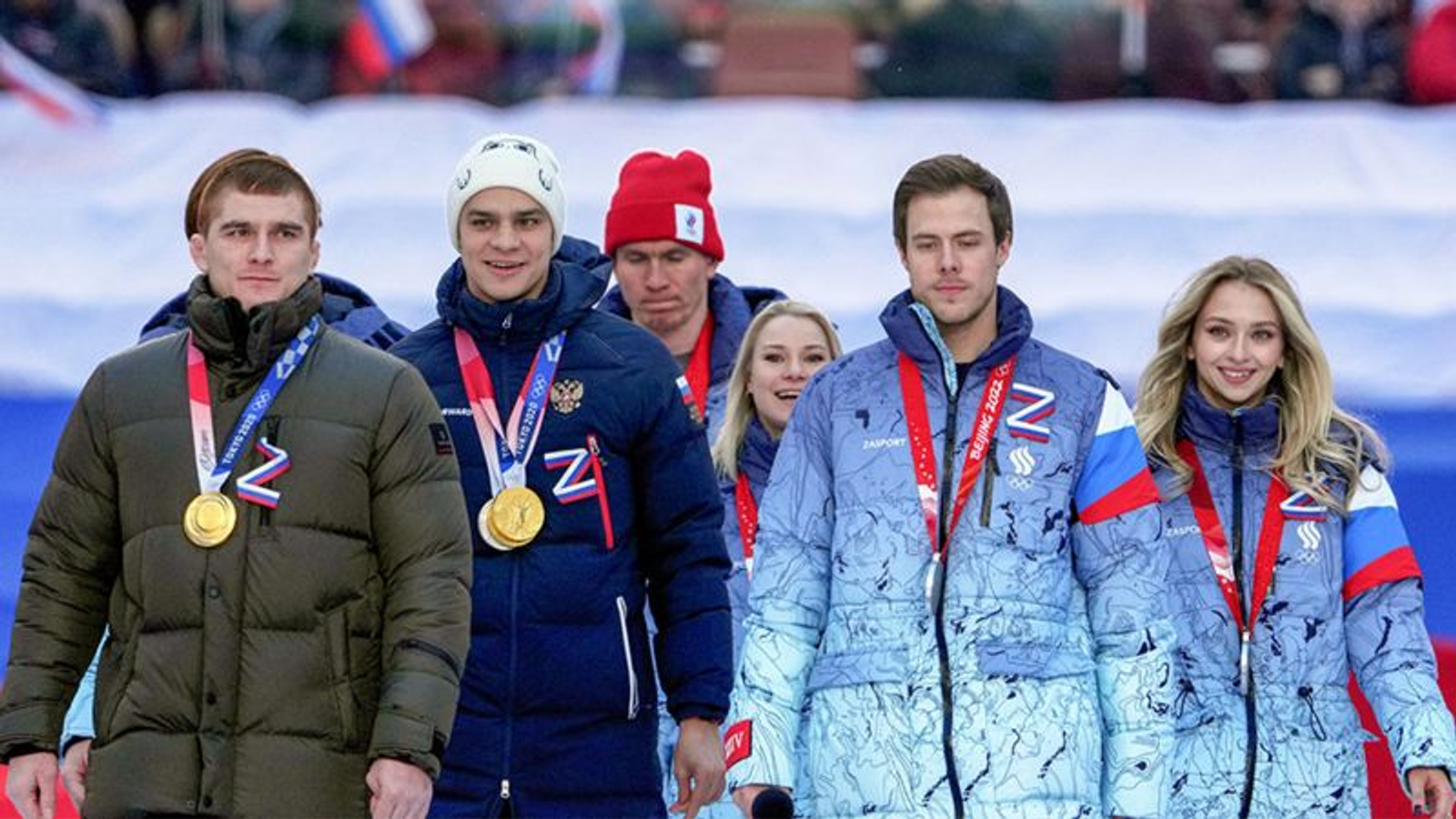 Cover image: Russian athletes, such as swimmer Evgeny Rylov (second to left) at a rally on the eighth anniversary of the annexation of Crimea. Photo: Alexander Vilf / TASS.