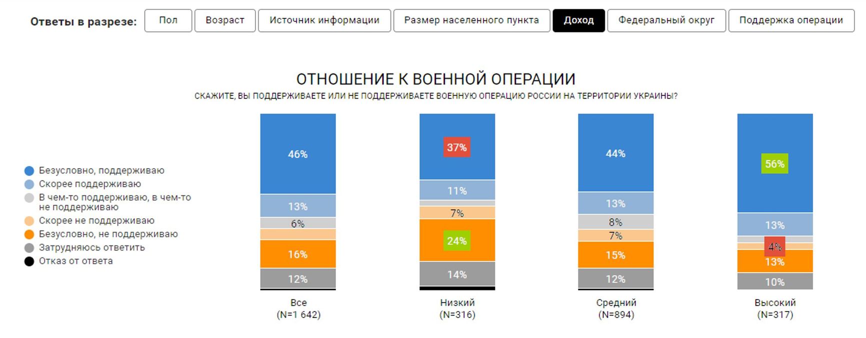 This case demonstrates how the collapse of conventional polling practices creates an environment that drives the development of “partisan sociology”. Apart from the AFC, we have seen new analytical initiatives by Project Athena, the above-mentioned Alexei Minyailo’s team, and Voronezh-based Qualitas Institute, whose data generally disprove the victorious declarations of pro-Kremlin pollsters. As to the study by Qualitas, what draws attention is the trend its authors overlooked in their conclusions: the correlation between a low level of income and low support for the military operation. As it turns out, contrary to the popular rhetoric about the strong anti-Kremlin sentiment being the privilege of the rich and the educated, the obtained data shows that the majority of those against the special operation belong to the low-income population group.