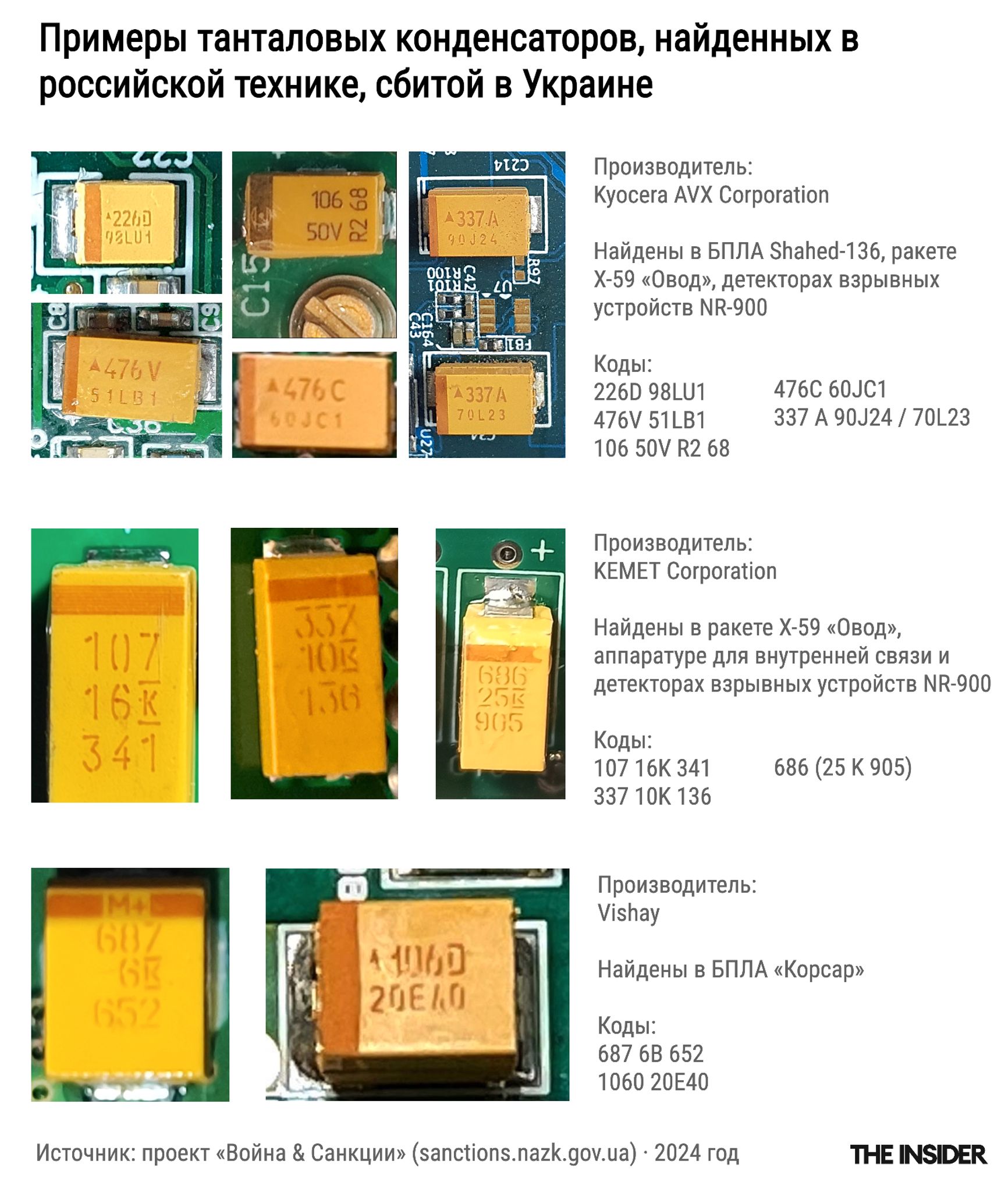 Среди деталей ракет и беспилотников, которые удалось идентифицировать, — конденсаторы производства Kyocera AVX, Vishay (компания делает детали как раз военного назначения) и KEMET Corporation. Все эти компании имеют головные офисы в США, однако детали их производства каким-то образом оказываются в России, а заканчивают свою судьбу в ракетах, которыми обстреливают украинские города. The Insider отследил путь этих конденсаторов, продажа и логистика которых должна быть под международным контролем.