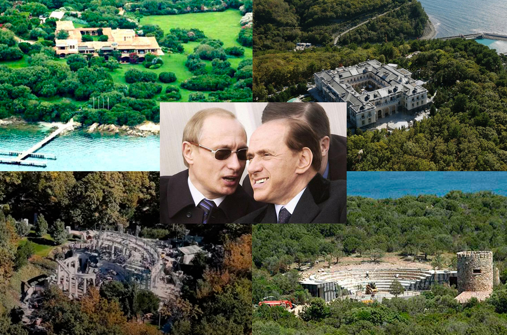 Экс-премьер Сильвио Берлускони, который на протяжении всей своей карьеры был в центре скандалов из-за коррупции и связей с мафией, был также символом чрезмерной тяги к dolce vita, чему даже был посвящен знаменитый фильм Паоло Соррентино «Лоро». И все же даже его вилла блекнет на фоне дворца Путина (как и на фоне путинских скандалов о коррупционных и мафиозных связях). Так, скандально известная вилла «Чертоза» на Сардинии Берлускони в четыре раза меньше дворца Путина — ее площадь составляет всего 4,5 тысячи м² против 17,6 тысячи м² дворца на мысе Идокопас под Геленджиком. Сады у Берлускони занимали всего каких-то 120 гектар. Территория же резиденции Путина располагается на 7800 гектарах, куда входят лес, гора и линяя пляжа. И вилла, и дворец расположены на берегу моря.