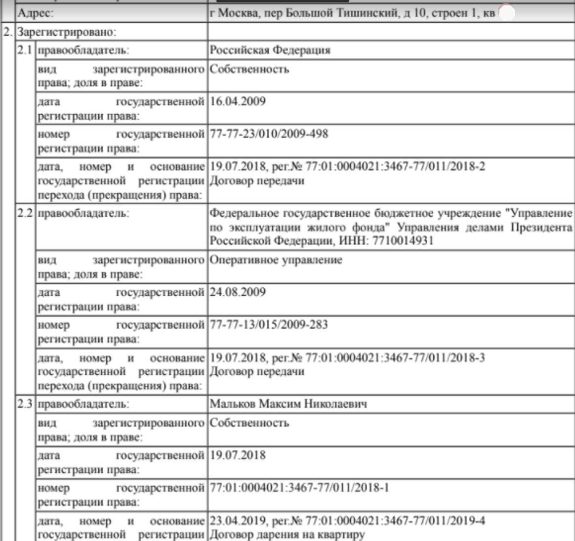 Так совпало, что буквально через несколько месяцев после окончания выборов Максим Мальков, будучи обычным студентом, получил бесплатно квартиру от управления делами президента. Согласно выписке из Росреестра, спустя год он подарил квартиру матери, и теперь она фигурирует в ее предвыборной декларации.