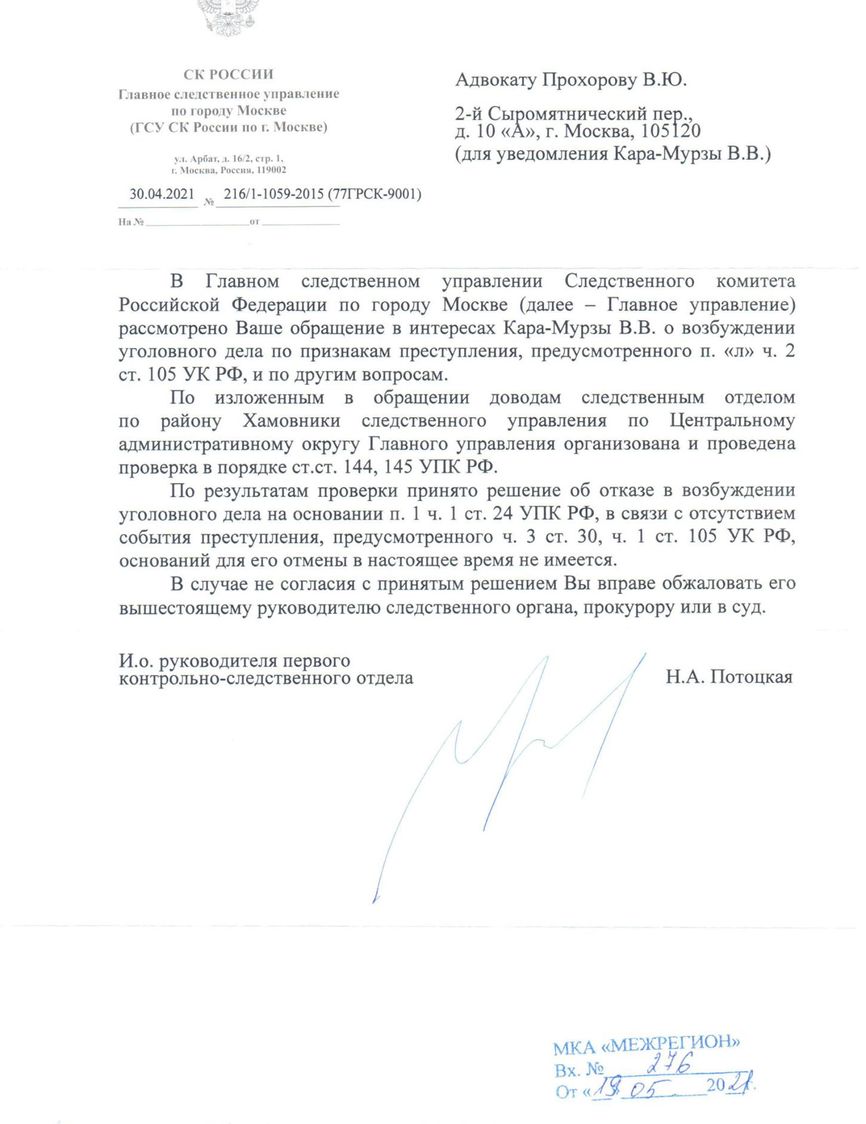 «На днях адвокат Вадим Прохоров получил из Главного следственного управления СКР по Москве ответ на поданное нами 18 февраля заявление о преступлении и возбуждении уголовного дела по ст. 105 с применением ст. 30 УК РФ (покушение на убийство) в связи с двумя моими отравлениями в мае 2015 и феврале 2017 года.