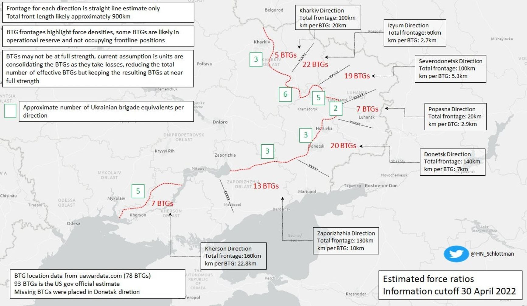 По нормативам, утверждённым в 1982 году, и до сих пор действующим в ВС РФ - батальонно-тактическая группа (600-800 военных) — основной наступательный юнит у россиян — может вести наступательные действия на участке фронта 1-2 километра, либо же оборонять до пяти километров фронта. На Харьковском направлении, где россиян медленно, но эффективно вытесняют ВСУ, сосредоточено пять российских БТГ, на участке фронта длинною в 100 км, то есть в четыре раза меньше норматива. Кроме того, некоторые БТГ недоукомплектованы личным составом и насчитывают по 500-600 человек.