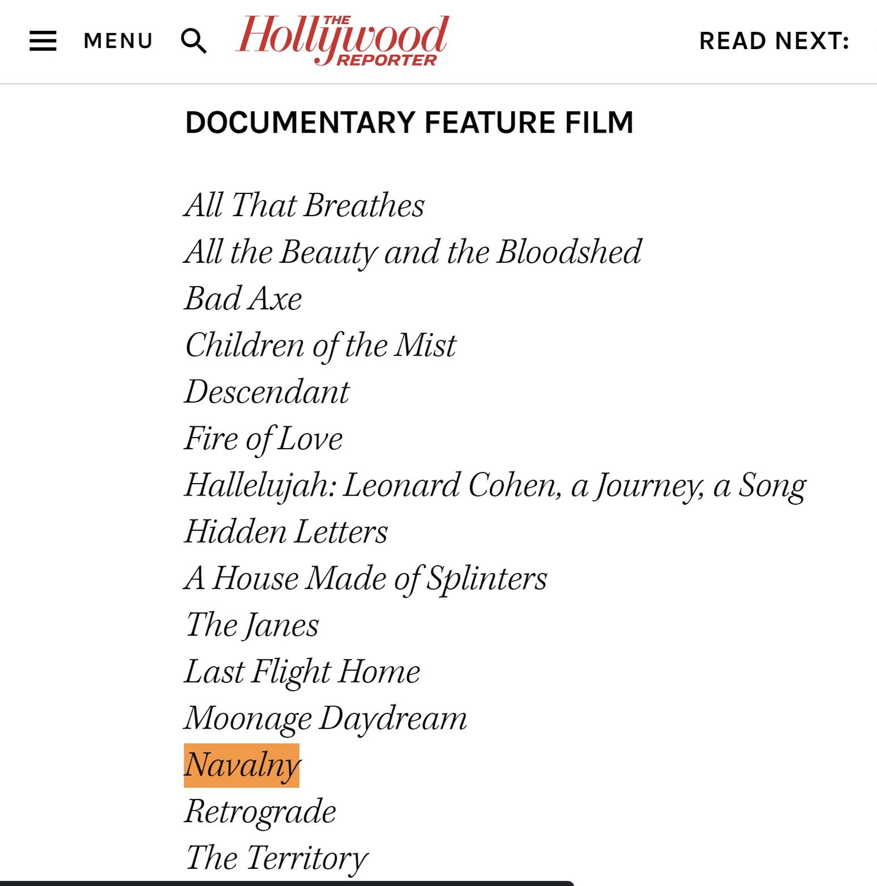 Академия кинематографических искусств и наук опубликовала шорт-лист премии «Оскар» 2023 года в 10 категориях, включая документальные фильмы. В список попал и фильм «Навальный», снятый HBO и CNN Films.