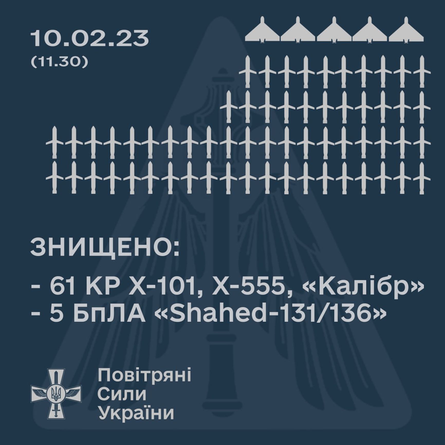 Утром 10 февраля Россия вновь нанесла массированный удар по Украине, в результате чего пострадали объекты энергетики. По данным украинских властей, на этот раз Россия выпустила по Украине 71 ракету, а также 5 дронов-камикадзе Shahed-131/136. Украинской ПВО удалось сбить 61 ракету.