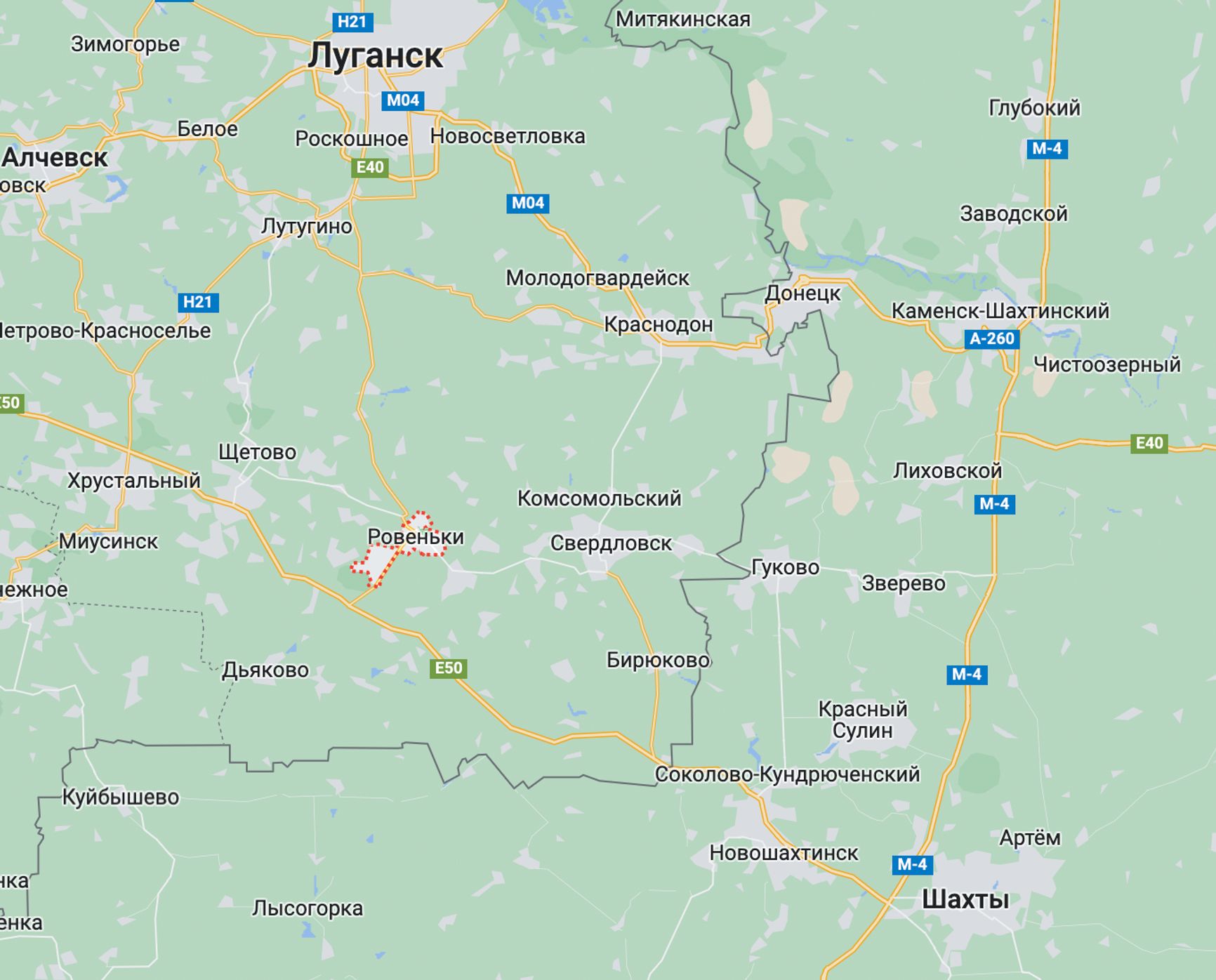 Ровеньки находятся в 60 км от границы с РФ, до пограничного пункта «Новошахтинская граница» и Ростовской области можно доехать на машине за один час (62–67 км в зависимости от выбора маршрута).