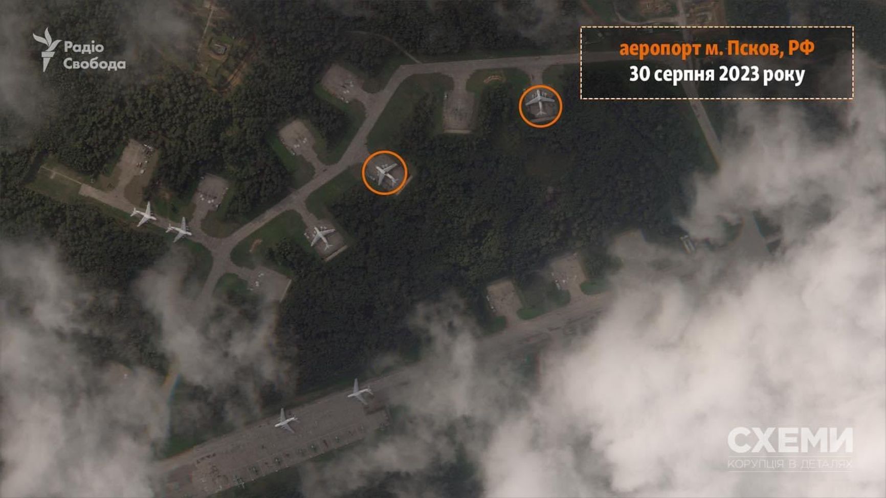 Проект «Схемы» публикует спутниковые снимки международного аэропорта Пскова, пережившего атаку беспилотников в ночь на 30 августа. На них заметны два поврежденных военно-транспортных самолета Ил-76.