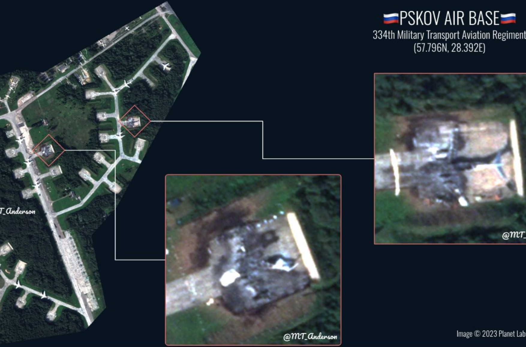 Два самолета Ил-76 сгорели полностью, еще два получили повреждения в результате атаки беспилотников на международный аэропорт Пскова, где базируется 334-й военно-транспортный авиационный полк 61-й воздушной армии, в ночь на 30 августа. Это следует из спутниковых снимков, опубликованных исследователем под ником MT Anderson.