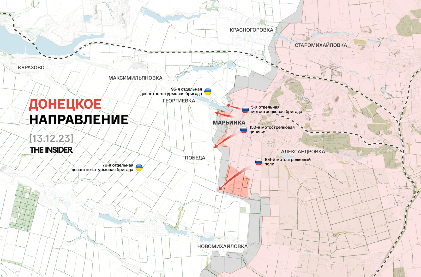 Российские «военкоры» опять объявили о взятии Марьинки, опубликовав видео установки не только российского флага, но и «Знамени Победы» (копии знамени, установленного на Рейхстаге в 1945 году) на западных окраинах города. Z-канал «Два майора» отчитывается о полной зачистке города и пишет о «предстоящей большой работе» по выдавливанию ВСУ из его окрестностей. Однако через несколько часов этот же канал опубликовал информацию о том, что ВС РФ «усилили давление в северо-западной части города».