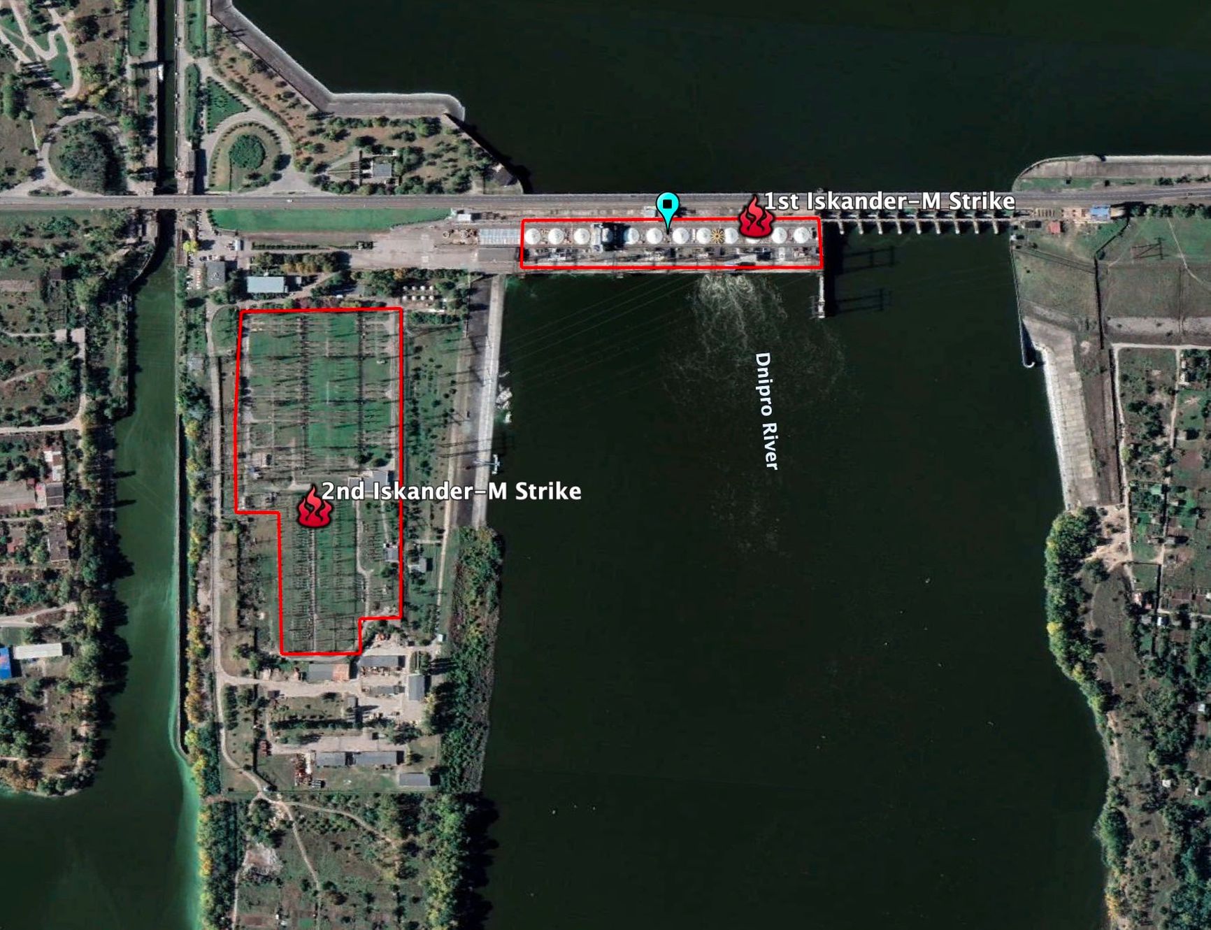 Видео удара по Кременчугской ГЭС публикует Telegram-канал «Повёрнутые на Z войне». Геолокацию атаки подтверждает ресурс Ukraine Battle Map. По его информации, одна ракета «Искандер-М» поразила генератор на плотине, а вторая — подстанцию ​​и линии электропередачи.