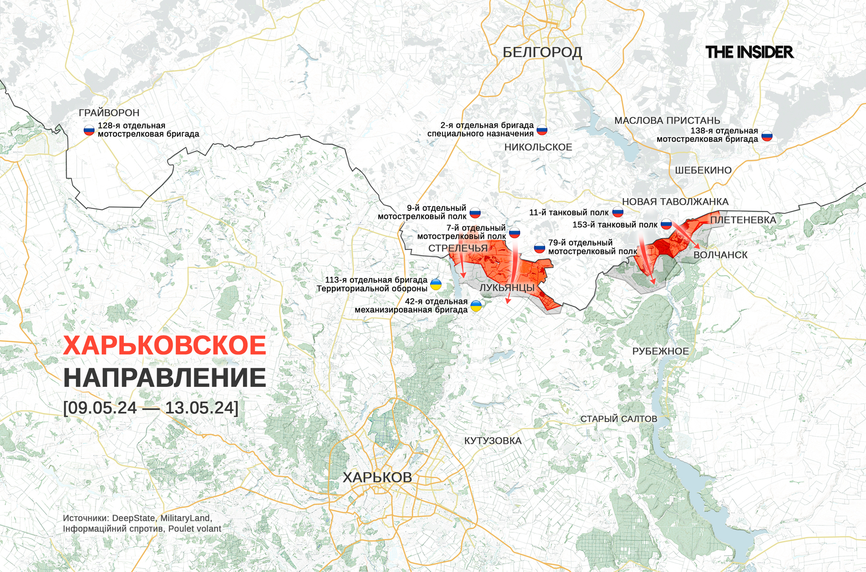 К вечеру 13 мая появились противоречивые сведения о ситуации в Волчанске. Генштаб ВСУ пишет, что украинские военные вытеснили противника с севера города и проводят там зачистку. В то же время «военкор» Юрий Котенок сообщает, что ВС РФ контролируют от четверти до трети города, а «Рыбарь» уже призывает создать «буферную зону» не только в Харьковской области, но и в Сумской.