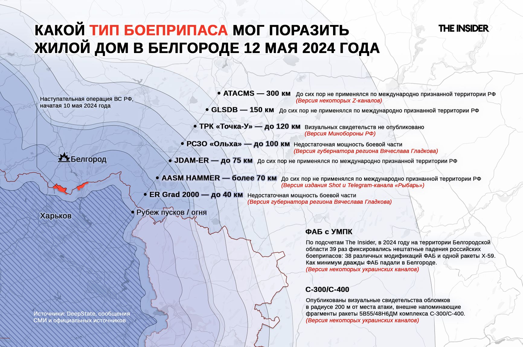 По подсчетам The Insider, всего в 2024 году на территории Белгородской области 39 раз фиксировались нештатные падения российских боеприпасов: 38 различных модификаций ФАБ и одной ракеты Х-59. Как минимум дважды ФАБ падали в Белгороде.
