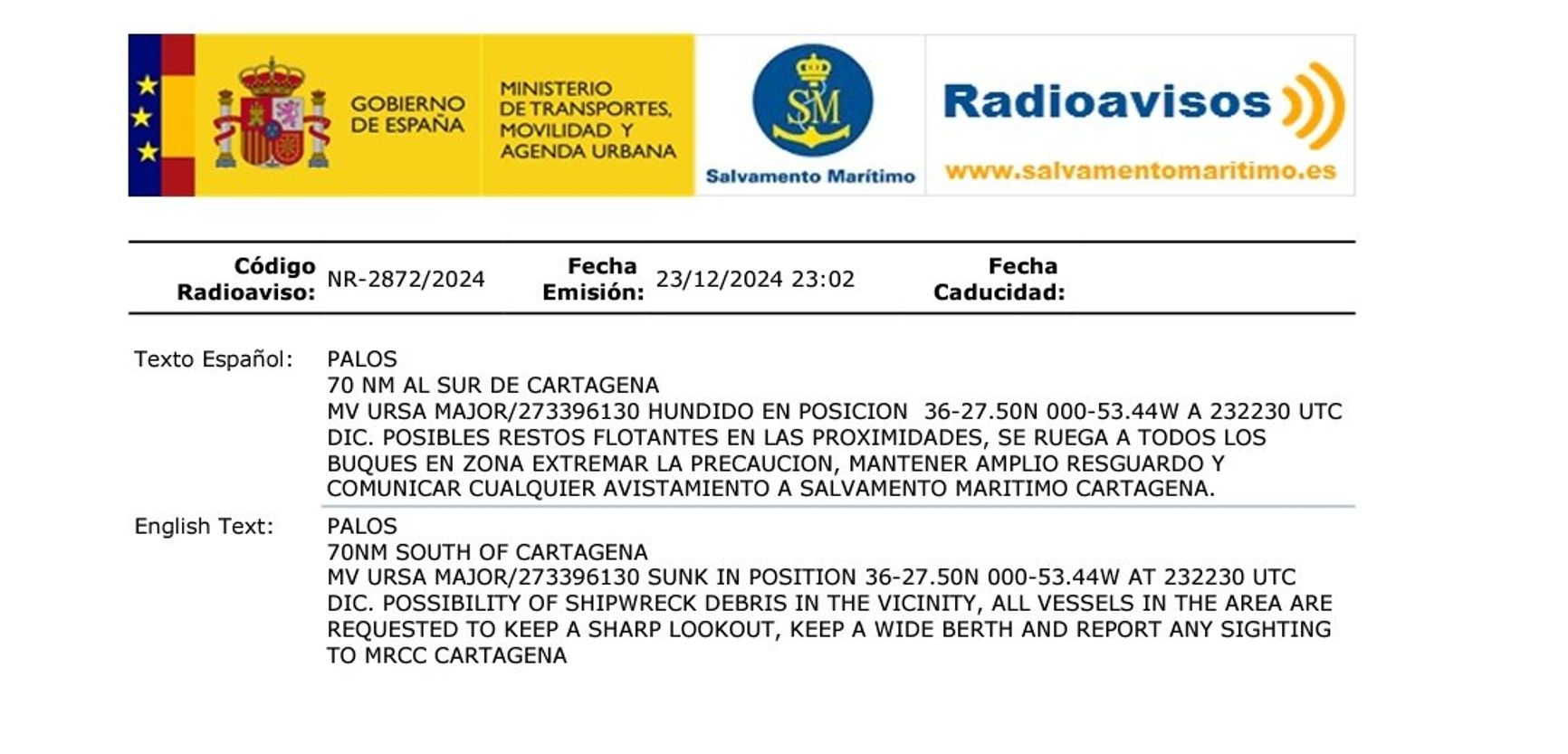 Тем временем министерство транспорта Испании, ссылаясь на данные системы Navtex, подтвердило, что «Урса Майор», другое судно той же компании, затонуло 23 декабря в международных водах между Испанией и Алжиром. Сухогруз направлялся из Санкт-Петербурга во Владивосток и перевозил портовые краны, а также, предположительно, люки для атомного ледокола «Россия» проекта «Лидер».