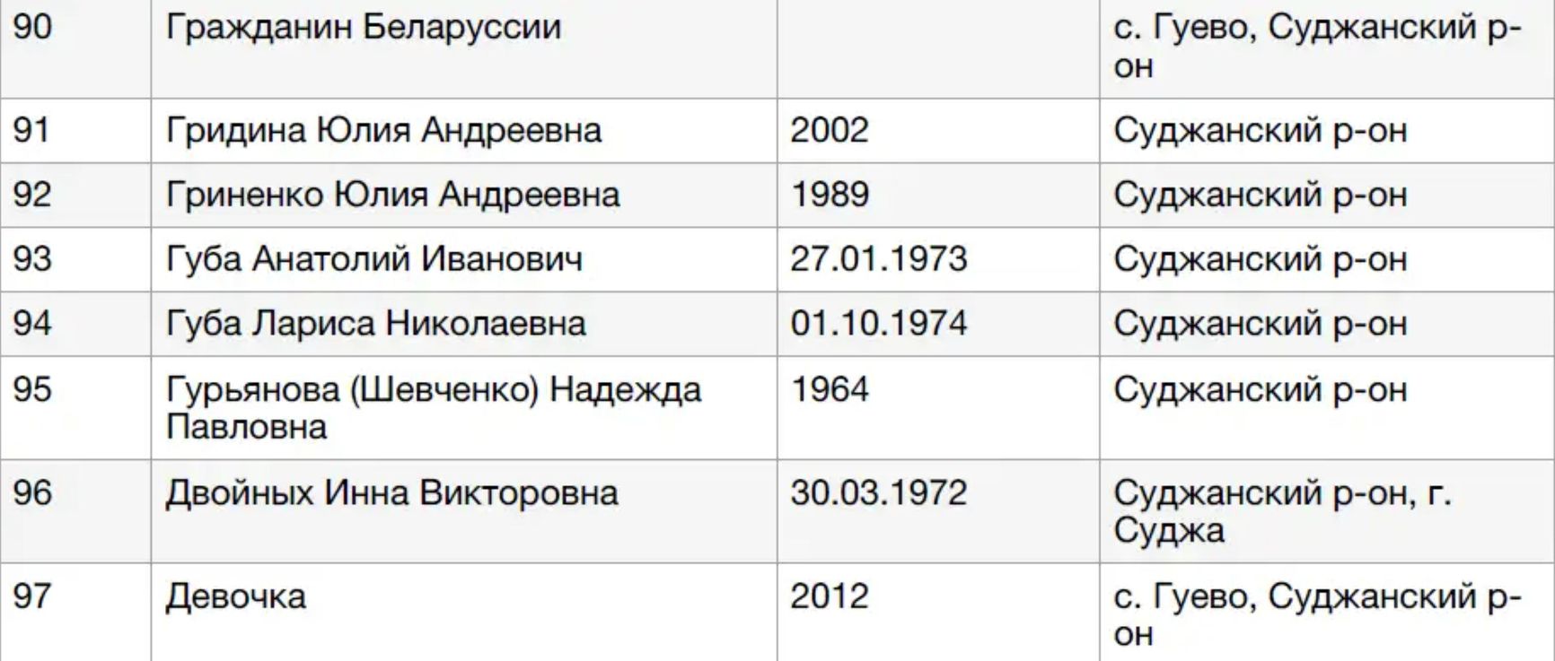 В перечне, опубликованном Москальковой, содержится информация о «517 разыскиваемых гражданах». Однако имена и фамилии указаны не у всех: вместо них в таблице написано, например, «знакомая Сазоновой Т.Б.» или «брат Резниковой Н.Ф.». Есть также записи «жители села Гуево», «девочка» и «гражданин Беларуссии» без каких-либо дополнительных данных.