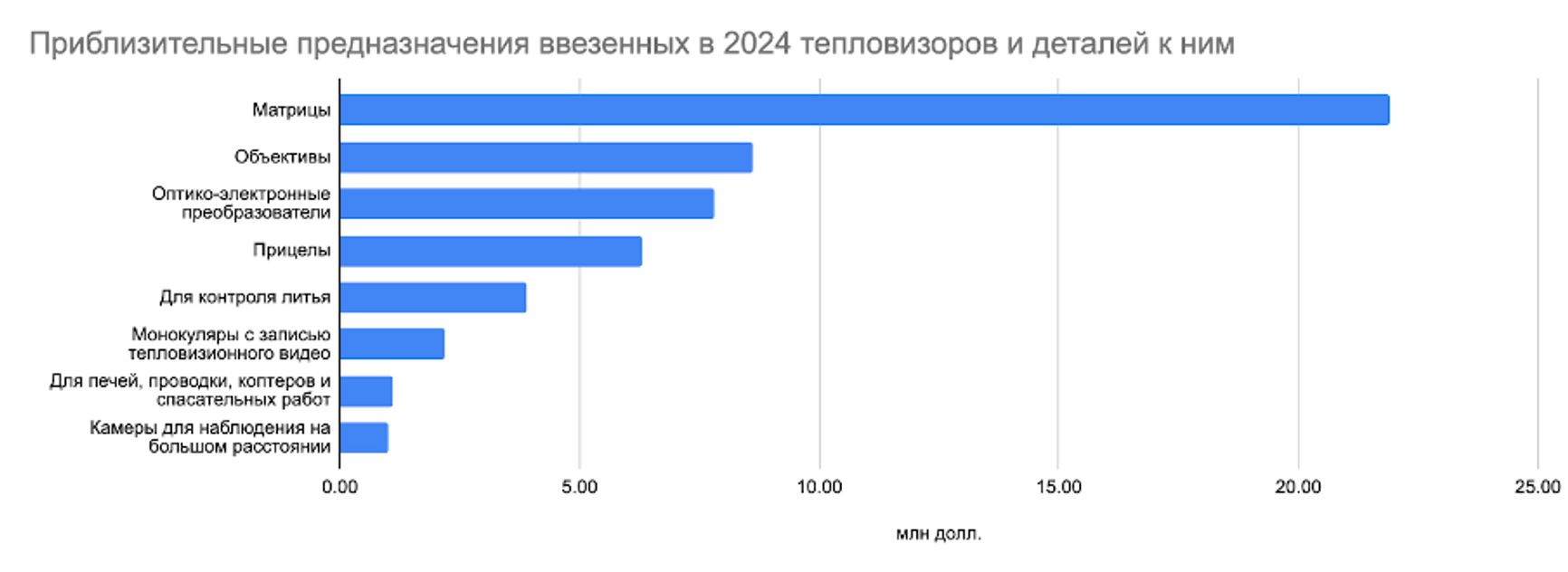 Ввозились, согласно таможенным документам, в частности матрицы, объективы, оптико-электронные преобразователи, прицелы, тепловизоры для контроля литья, монокуляры с записью тепловизионного видео, тепловизоры для печей, коптеров и спасательных работ, а также электропроводки, камеры для наблюдения на большом расстоянии.