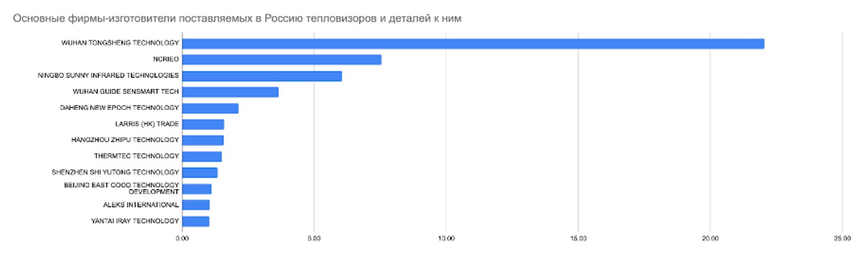 На втором месте среди заявленных производителей — китайская NCRIEO — реально существующий крупный производитель с оборотом $7 млн по импорту товаров этой торговой марки в 2024 году. На третьем месте с $6 млн импорта тепловизионных компонентов — Ningbo Sunny Infrared Technologies — дочерняя фирма Sunny Optical Technology. На четвертом месте — Wuhan Guide Sensmart Tech с $3,6 млн импорта ее товаров.