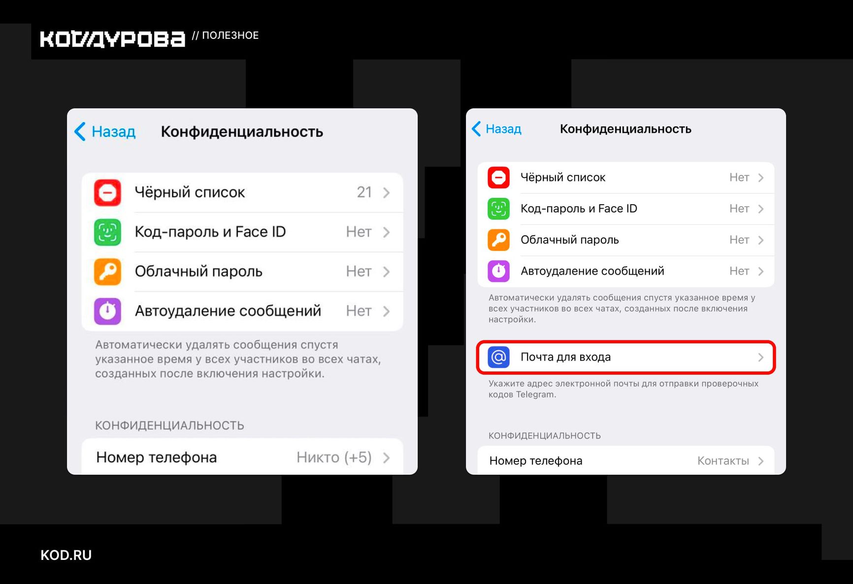 Новая функция, обращает внимание портал, вынесена отдельной кнопкой в разделе «Конфиденциальность» (Настройки → Конфиденциальность → Почта для входа). На привязанную электронную почту будут приходить коды для входа в приложение.