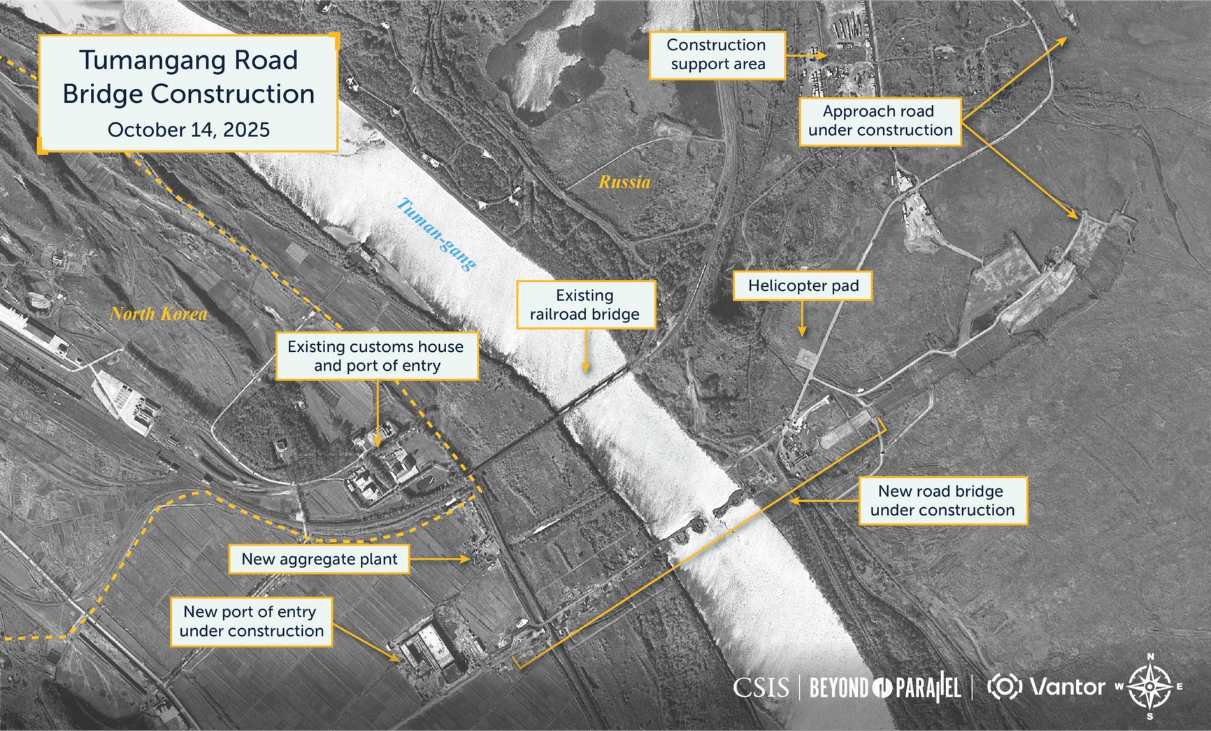 Между Россией и КНДР строят автодорожный мост через реку Туманная на их общей границе, сообщает вашингтонский аналитический центр Center for Strategic and International Studies (CSIS), изучивший спутниковые снимки. С учетом съездов, общая длина моста составит не менее 1,3 километра. По оценкам аналитиков, мост и сопутствующая инфраструктура должны быть открыты в первом квартале 2026 года, в зависимости от тяжести предстоящей зимы и доставки ресурсов с обеих сторон.