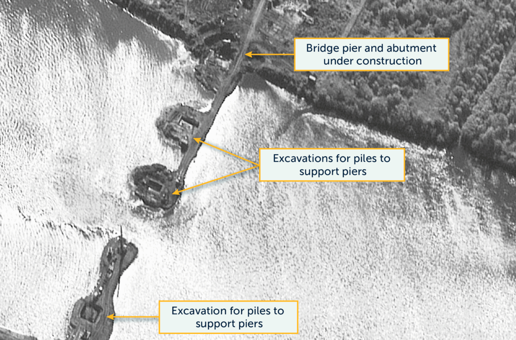 Для поддержания строительства Россия создала крупную базу снабжения и временный бетонный завод примерно в километре севернее от стройки, а также начала прокладку новой трассы длиной 1,9 км от существующей дороги, ведущей к приграничному российскому поселку Хасан.