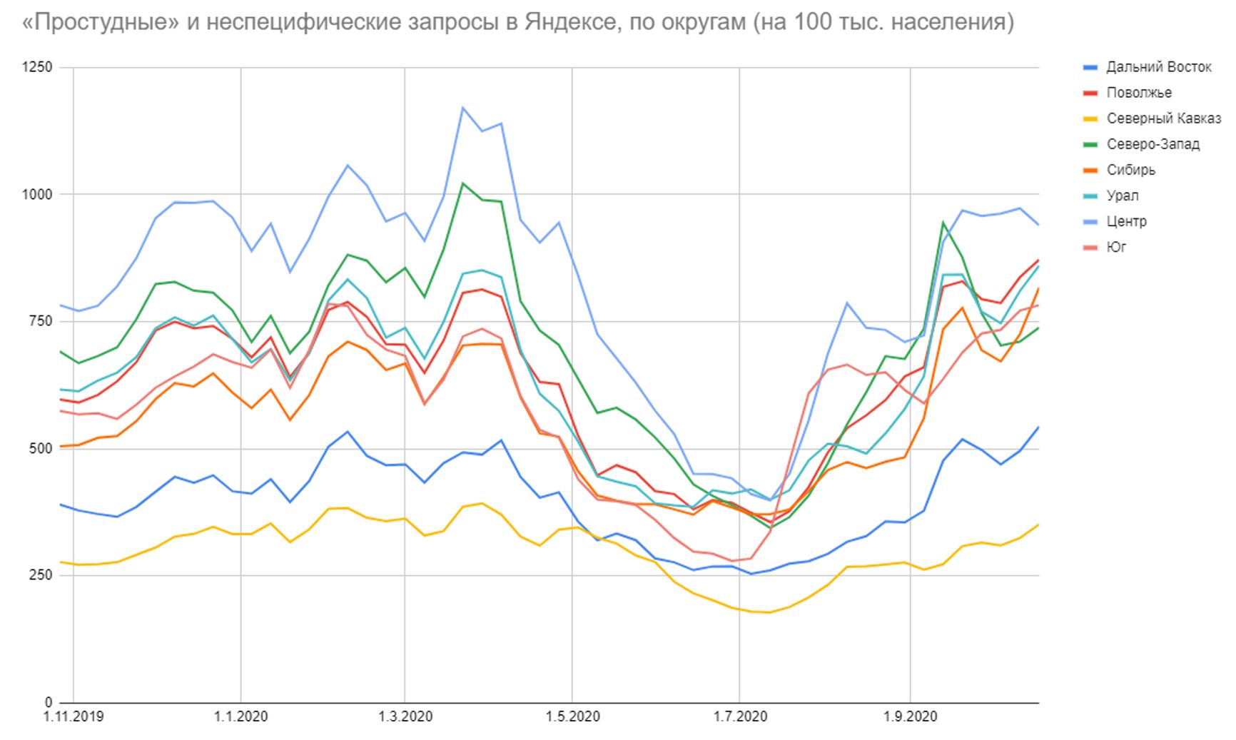 На Северном Кавказе — тише всего (в основном за счёт трёх регионов, где заболеваемость, как и запросы, на нуле). Северо-Запад и Дальний Восток начали расти — и тревожнее всего выглядят дальневосточные регионы, которые обошлись без полноценной первой волны. За единственным исключением: это Камчатка.
