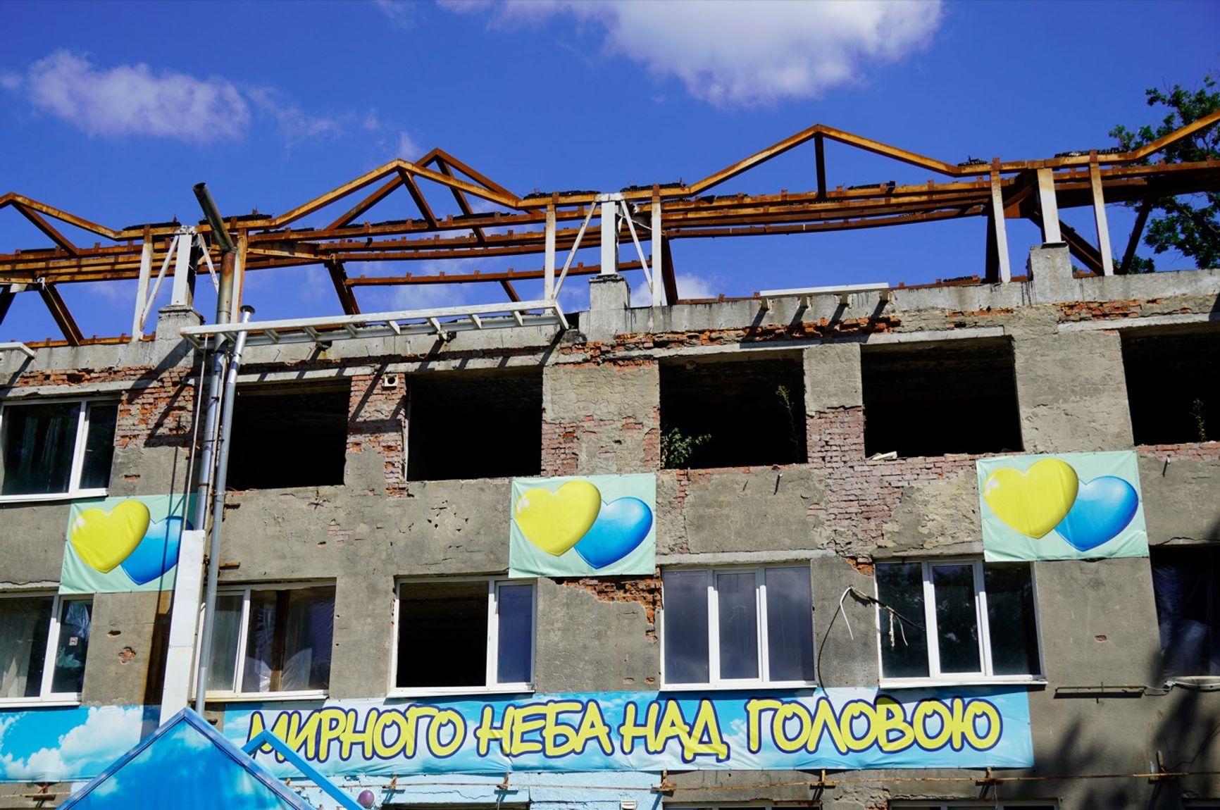 Экскурсии, кстати, заказать толком негде — главное административное здание парка до сих пор в руинах. На его изрешеченных осколками стенах висит транспарант с пожеланием «мирного неба над головою». Судя по тому, что ткань транспаранта цела, повесили его уже после начала реконструкции парка.