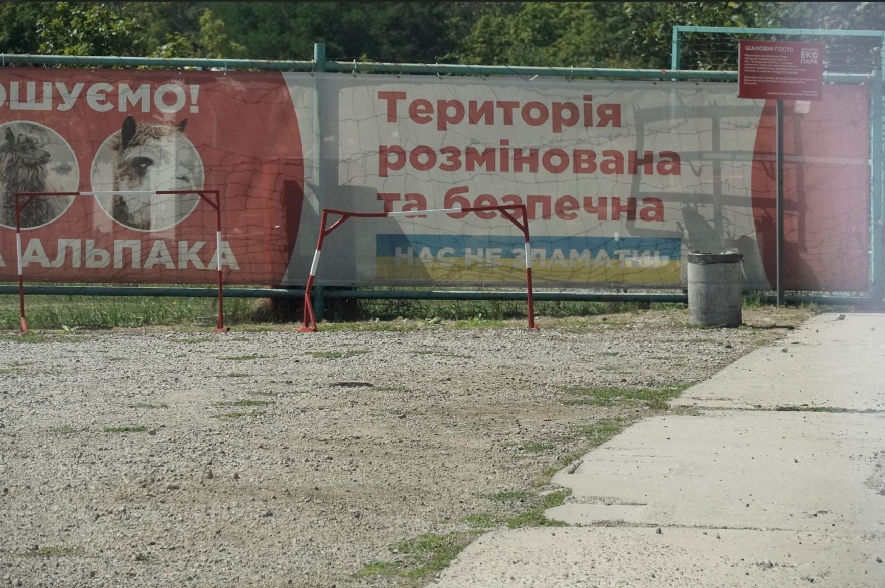 Посетителей, правда, не очень много. Несмотря даже на бесплатный вход и вновь курсирующие прямые автобусы из Харькова. На самом деле экопарк производит гнетущее впечатление. Тут до сих пор масса разрушенных вольеров, время от времени натыкаешься на сожженные здания и таблички, которыми отмечены места падения российских ракет.