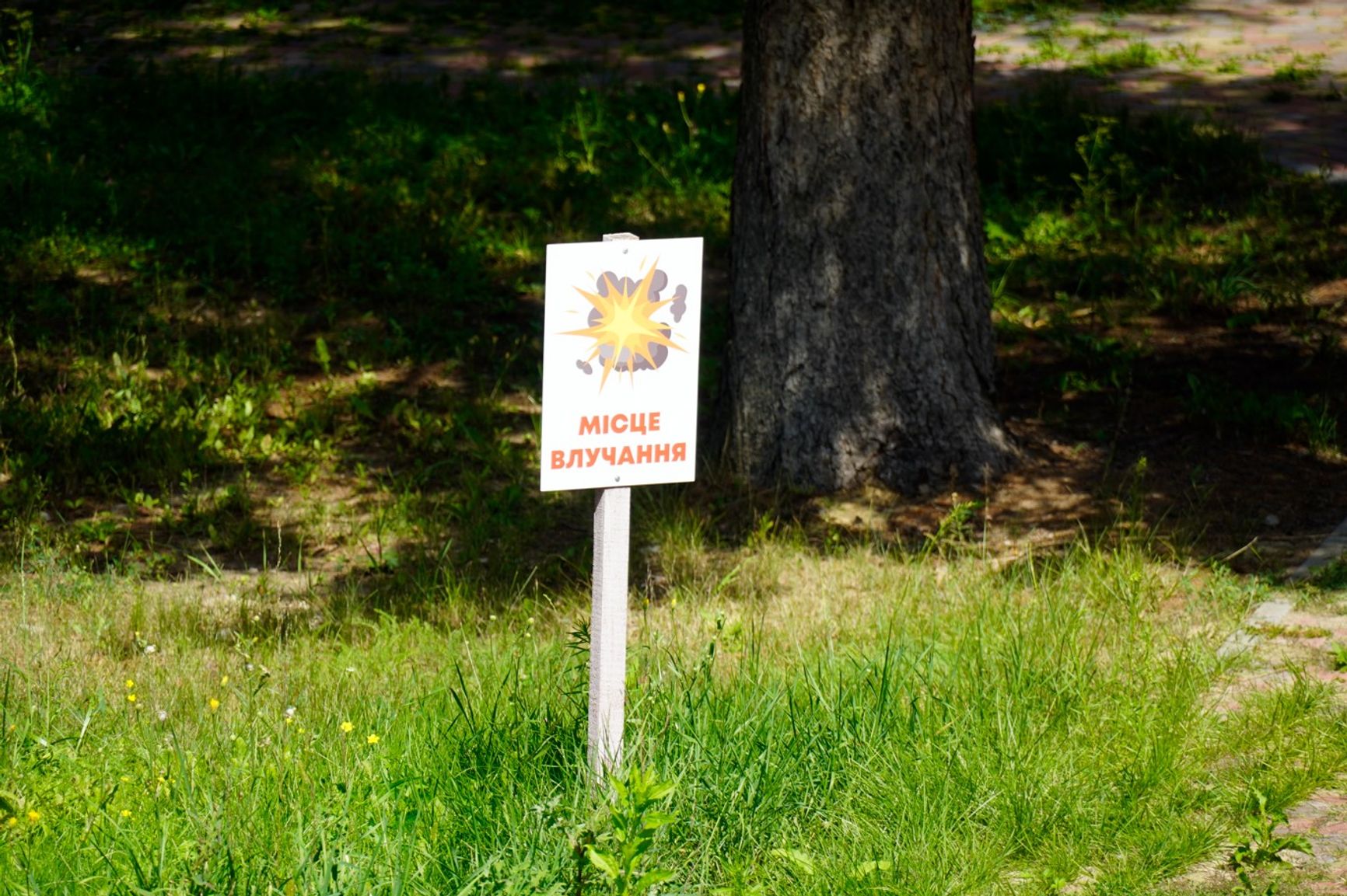 В траве лежат куски российских ракет, которые падали на парк, а синие кабинки биотуалетов продырявлены осколками от этих ракет. Для спокойствия посетителей установлены таблички, сообщающие, что территория разминирована и безопасна.