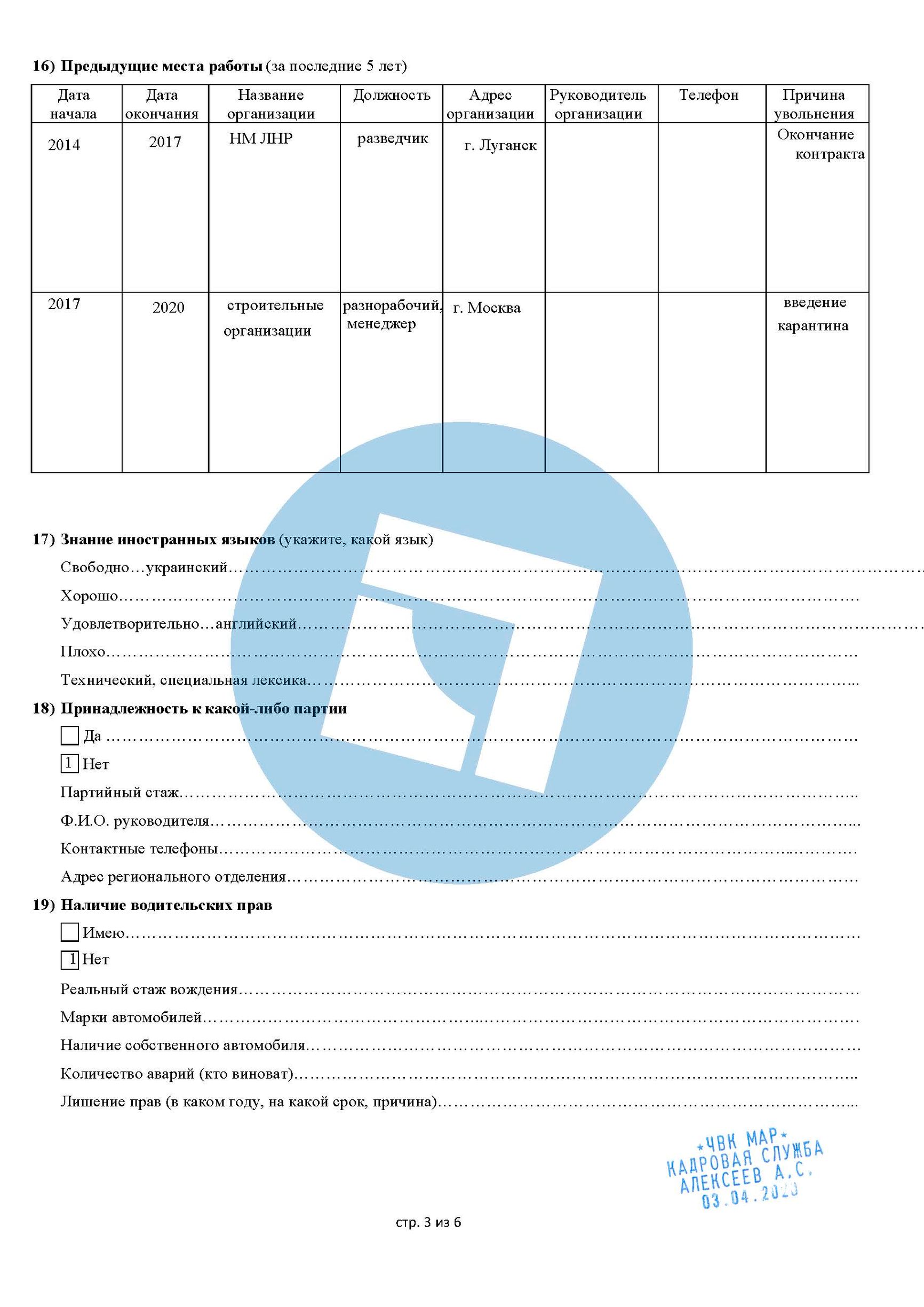 Решение передать набор на аутсорсинг «Шаману» быстро принесло свои плоды. К концу мая фальшивая ЧВК получила десятки новых заявок, все они ссылались на «Шамана» как на своего референта. Бланки заявлений были составлены так, чтобы это выглядело как формы, ранее использовавшиеся настоящей ЧВК «МАР», и на каждой форме была проставлена печать этой ЧВК с указанным именем «директора по персоналу Алексеева». Формы, которые в конечном итоге были заполнены более чем 200 заявителями, содержали полные личные данные, включая текущий адрес, номера телефонов и электронную почту, рост, вес и размеры обуви, образование и военный опыт. The Insider и Bellingcat ознакомились с этими анкетами.